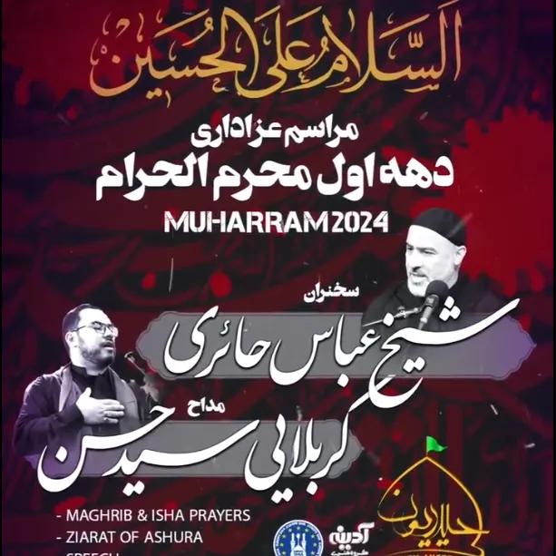 مراسم دهه اول محرم الحرام حسينيه حیدریون ادلاید سخنران: شیخ عباس حائری مداح: کربلایی سید حسن به مدت ۱۱ شب شام سر سفره ارباب دعوتین